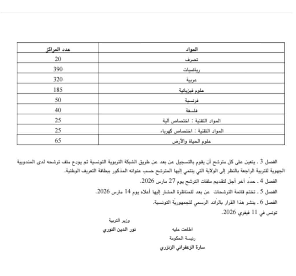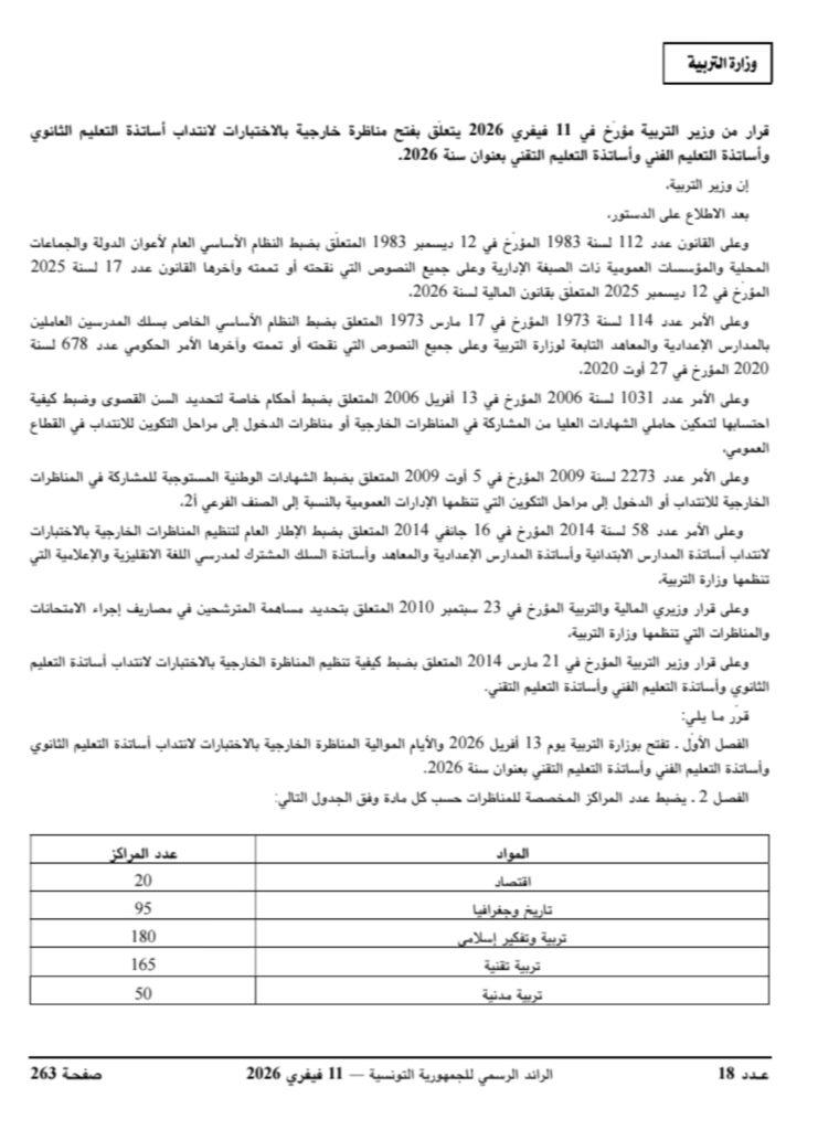 تفتح وزارة التربية يوم 13 أفريل 2026 والأيام الموالية المناظرة الخارجية لانتداب أساتذة تعليم ثانوي وأساتذة تعليم فني وأساتذة تعليم تقني بعنوان سنة 2026 وفق قرار صدر بالرائد الرسمي بتاريخ اليوم الاربعاء 11 فيفري 2026.