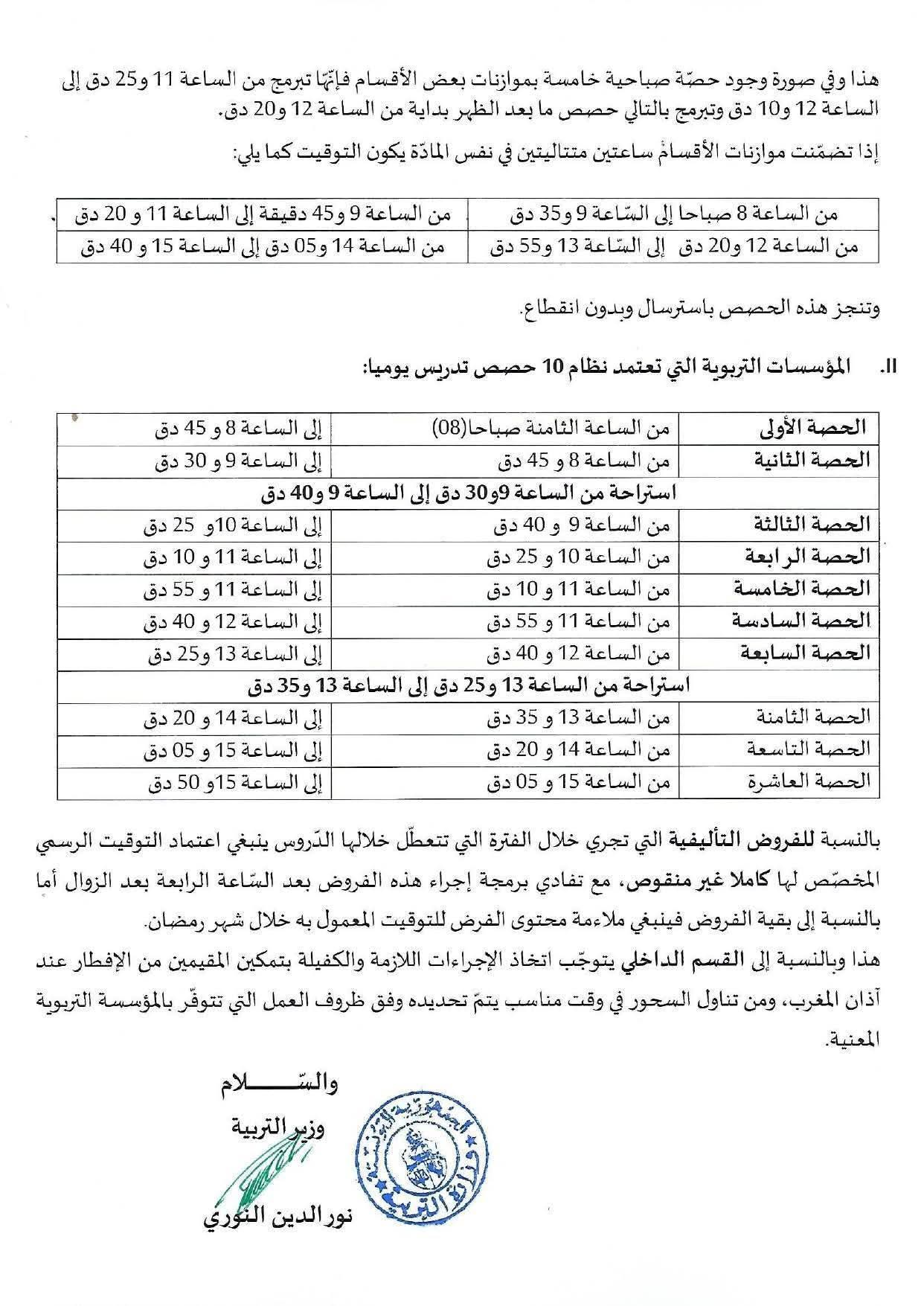 أصدرت وزارة التربية منشورًا موجّهًا إلى المندوبيات الجهوية للتربية وكافة الهياكل التربوية، يتعلّق بتنظيم سير العمل وأوقات الدراسة بالمدارس الاعدادية والمعاهد الثانوية العمومية والخاصة خلال شهر رمضان، وذلك في إطار الاستعدادات الخاصة بالسنة الدراسية 2025-2026 وضمان حسن تسيير النشاط التربوي خلال هذه الفترة.