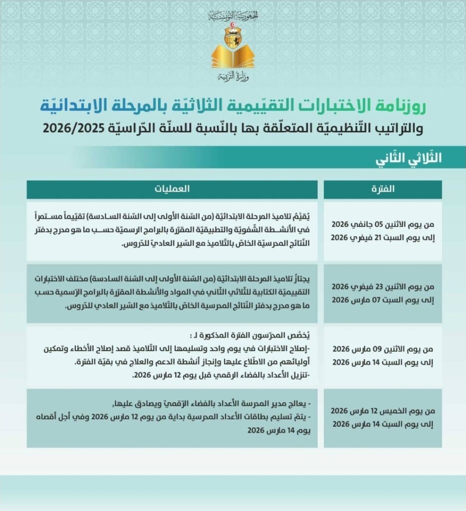 شرع صباح اليوم الإثنين 23 فيفري 2026 تلاميذ المرحلة الابتدائية والإعدادية والثانوية، في اجتياز الاختبارات الكتابية بعنوان الثلاثي الثاني للسنة الدراسية 2025-2026.