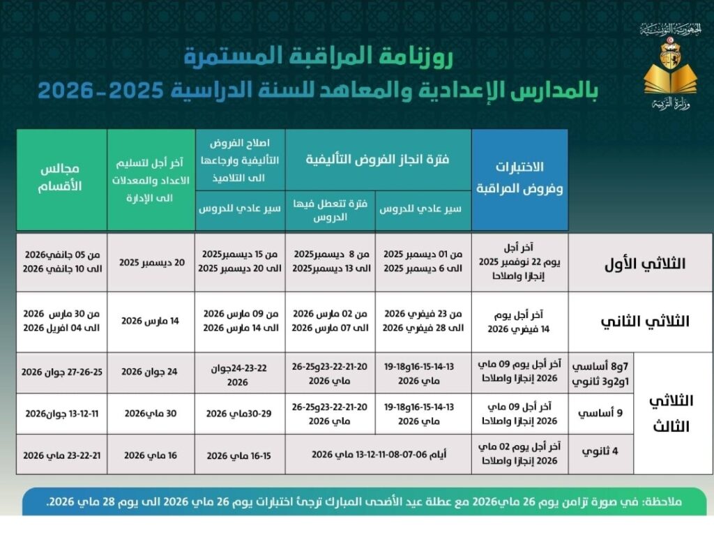وبالنسبة للمرحلة الإعدادية والثانوية، تتواصل الفروض التأليفية إلى غاية 7 مارس 2026 (من 23 إلى 28 فيفري مع السير العادي للدروس، ويكون الأسبوع المغلق من 2 مارس إلى 7 مارس مع تعطل الدروس).
