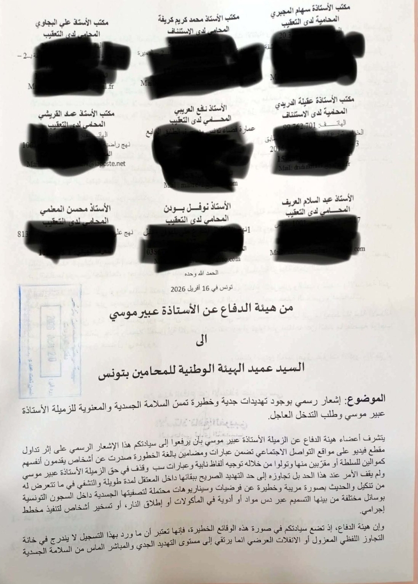 قامت هيئة الدفاع عن عبير موسي امس بايداع اشعار رسمي اعلمت فيه عميد المحامين بالتهديدات بالتصفية الجسدية التي طالت الاستاذة عبير موسي عبر منصات التواصل الاجتماعي.