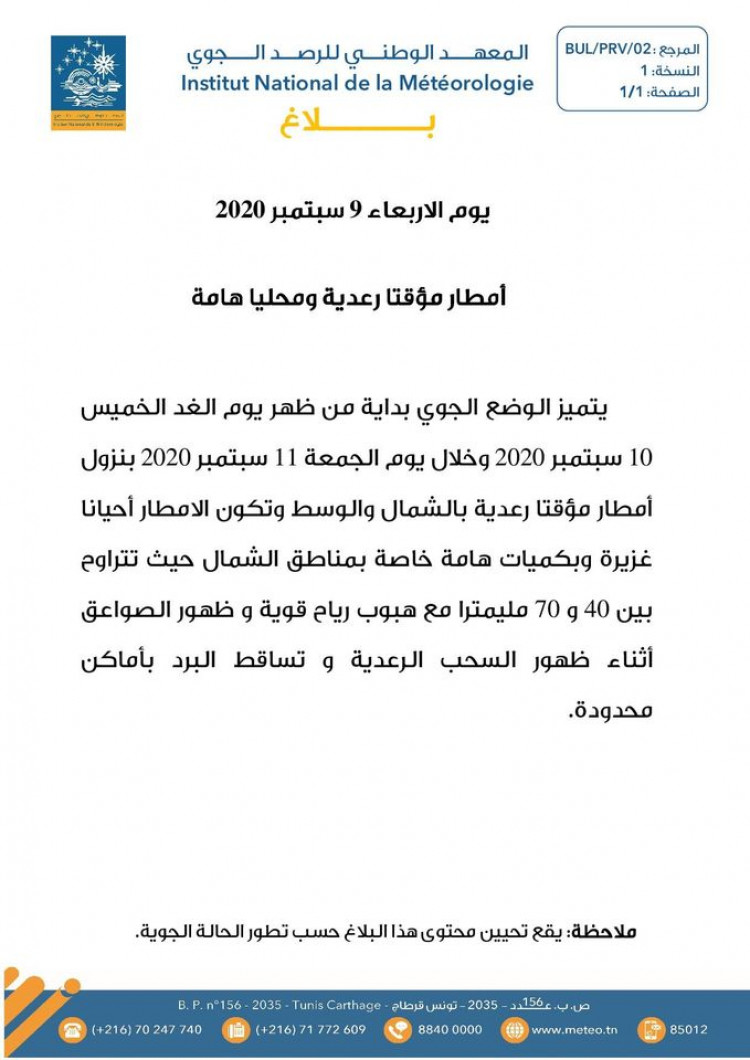 أعلن المعهد الوطني للرصد الجوي في نشرة متابعة أن الوضع الجوي يتميز بداية من ظهر يوم غد الخميس وخلال يوم الجمعة 11 سبتمبر 2020، بنزول أمطار مؤقتا رعدية بالشمال وبالوسط وتكون الأمطار احيانا غزيرة وبكميات هامة خاصة بمناطق الشمال حيث تترواح بين 40 و70 مليمترا مع هبوب رياح قوية وظهور الصواعق الرعدية أثناء ظهور السحب الرعدية وتساقط البرد بمناطق محدودة.
