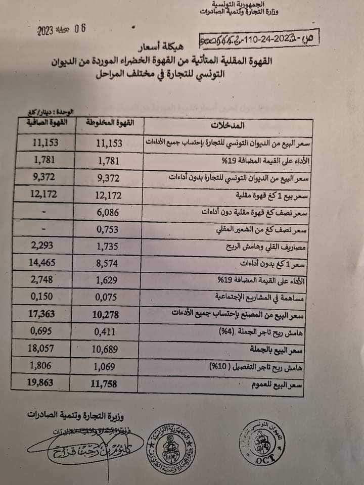 وبمقتضى هذه الزيادة فإنّ السعر الجديد للقهوة حدّد بـ 19.8 دينار للكلغ الواحد بعد أن كان سعرها محدّدا بـ 14.6 دينار.