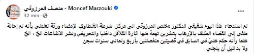 قال الرئيس الأسبق، المنصف المرزوقي، إنه تلقى اليوم استدعاء تسلّمه شقيقه، لإعلامه بأنه قد تمت إحالة ملفه إلى القضاء المكلف بالإرهاب في 20 تهمة منها “إثارة القلاقل داخليا والتحريض ونشر الاشاعات..
