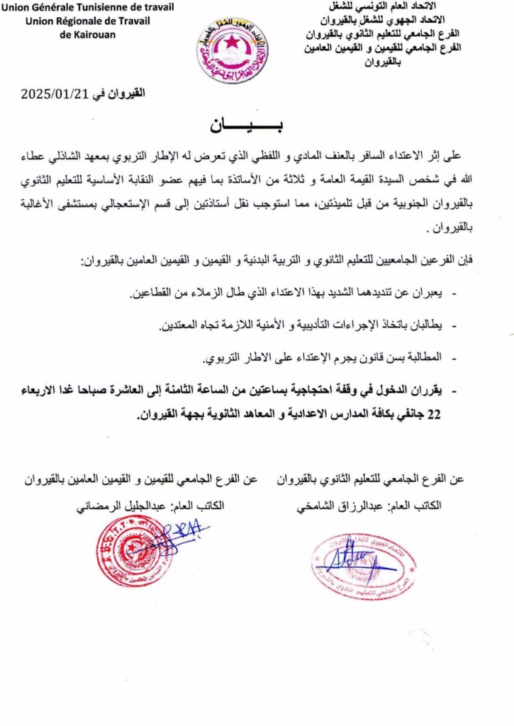وقد قرّرت النقابة الأساسية للتعليم الثانوي والاساسي والقيمين تنفيذ وقفة احتجاجية اليوم الاربعاء لمدة ساعتين ابتداء من الساعة الثامنة صباحا في كامل المؤسسات الاعدادية والثانوية بالقيروان وكل المعتمديات تنديدا بالاعتداء وتضامنا مع المتضرّرين والمطالبة باتخاذ الإجراءات التأديبية والامنية ضد المعتدين.