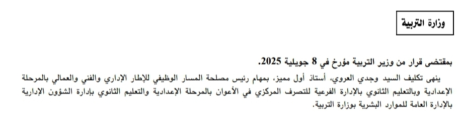 صدر بالعدد الاخير للرائد الرسمي للجمهورية التونسية قرار من وزير التربية مؤرخ في 8 جويلية 2025 يقضي بانهاء تكليف السيد وجدي العروي، أستاذ أول مميز، بمهام رئيس مصلحة المسار الوظيفي للإطار الإداري والفني والعمالي بالمرحلة الإعدادية وبالتعليم الثانوي بالإدارة الفرعية للتصرف المركزي في الأعوان بالمرحلة الإعدادية والتعليم الثانوي بإدارة الشؤون الإدارية بالإدارة العامة للموارد البشرية بوزارة التربية.