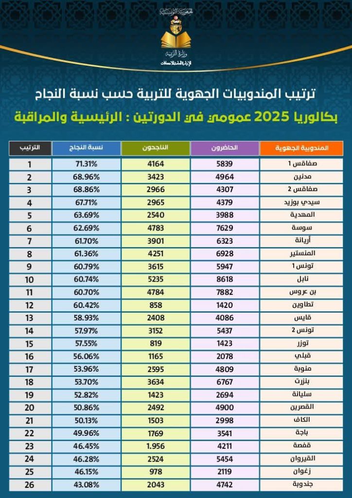 وفي ما يلي نسب النجاح في الدورتين الرئيسية والمراقبة حسب الولايات: