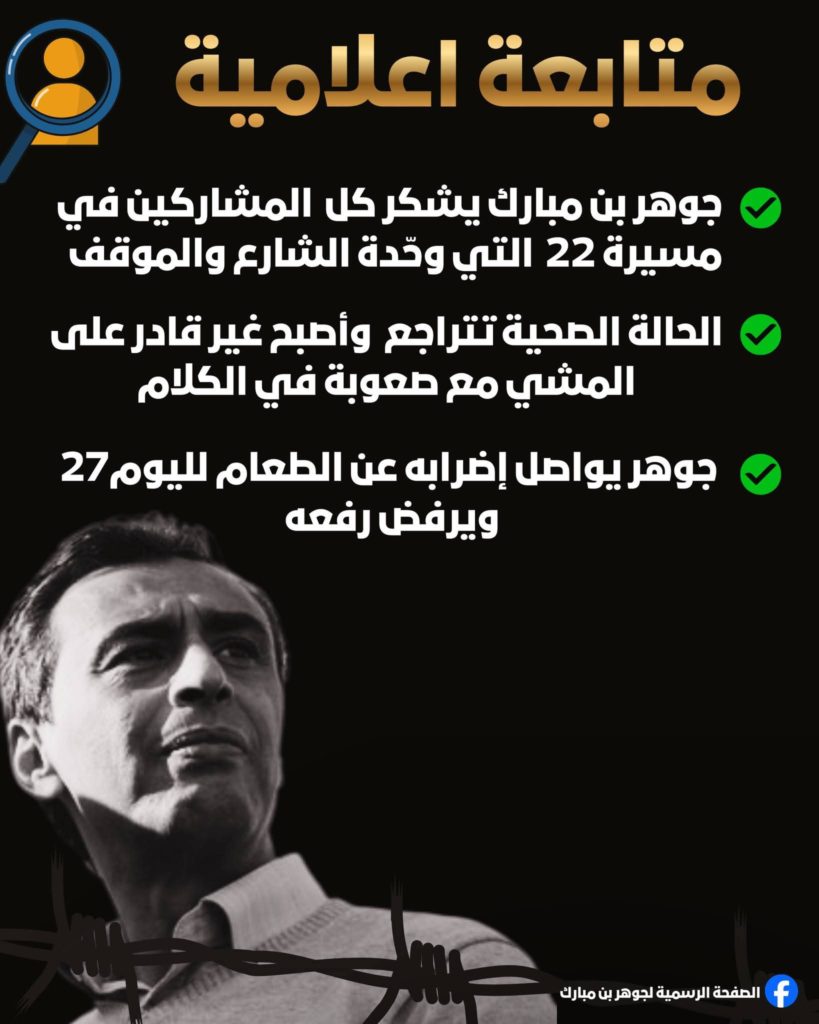 كشفت المحامية دليلة بن مبارك مصدق اخر مستجدات الوضع الصحي لشقيقها جوهر بن مبارك الذي مازال يواصل خوض اضراب جوع عن الطعام لليوم 27.